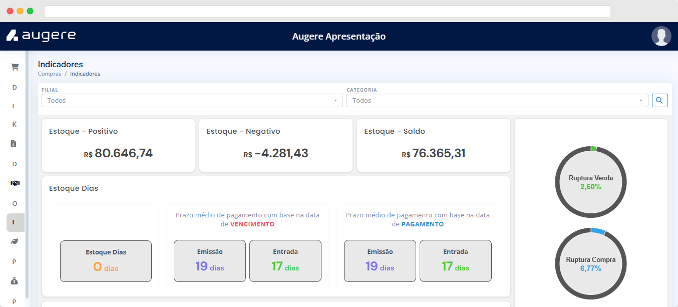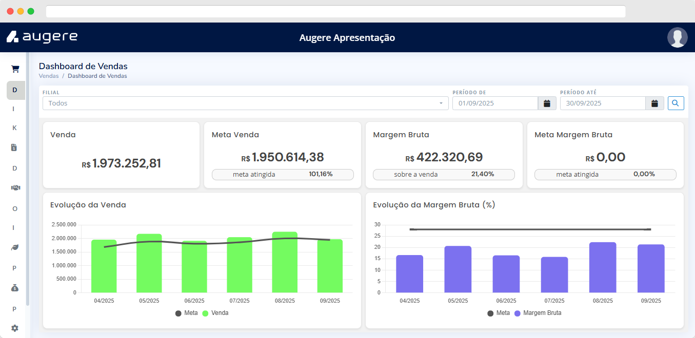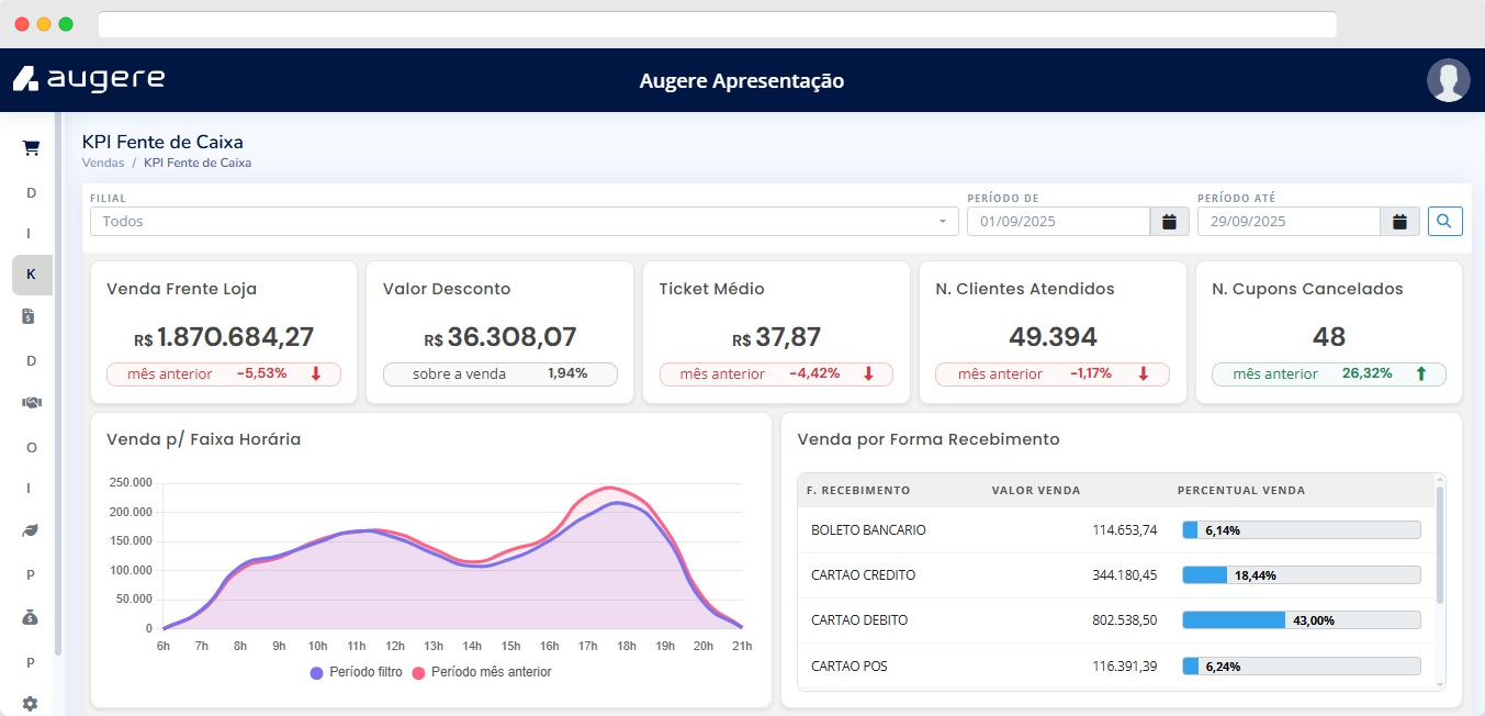 Com o Augere, sua equipe acompanha vendas, margem, ticket médio, clientes, rupturas, perdas e performance de checkout em painéis intuitivos, com filtros por período, loja, seção e operador. Nossos recursos de alertas e metas ajudam a reagir rápido e priorizar o que realmente impacta o resultado.
