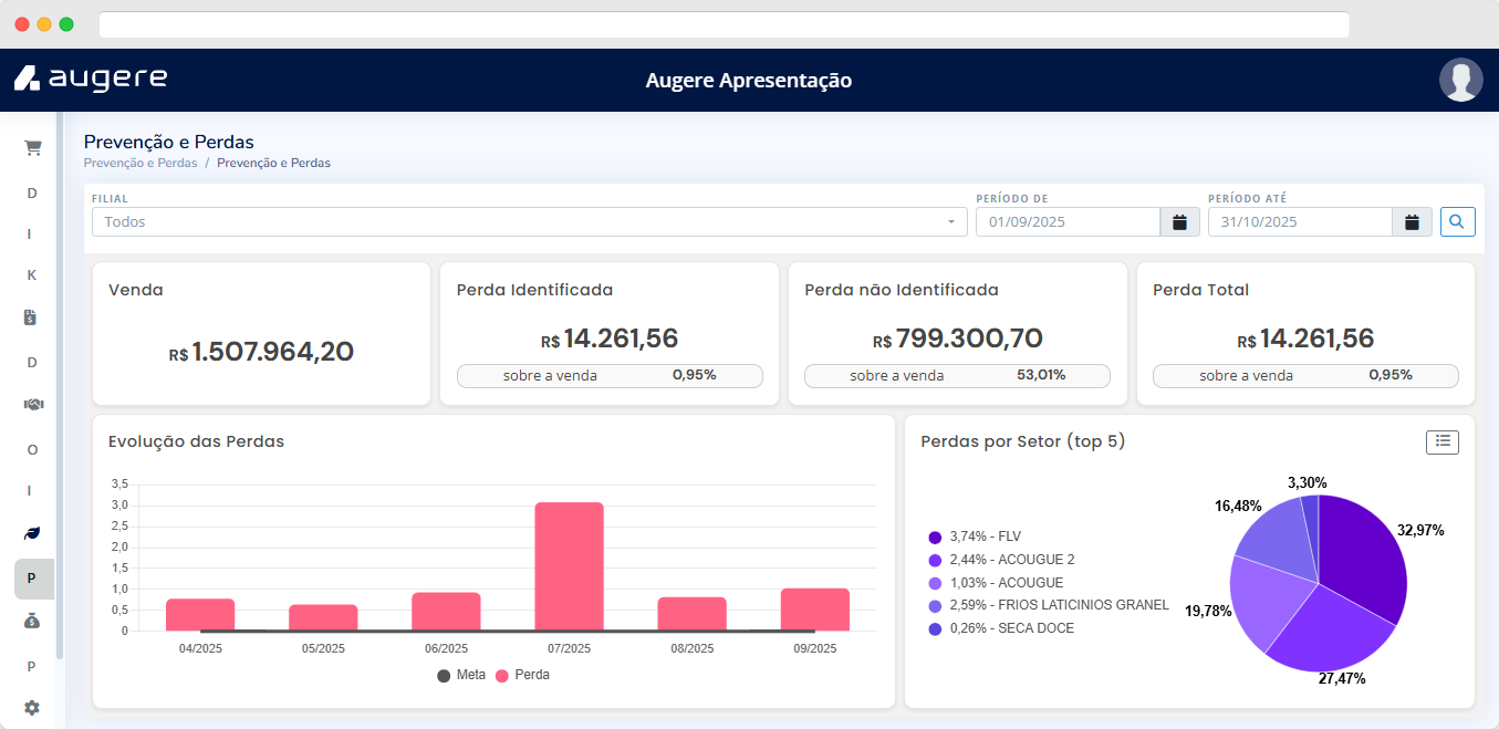 Visão clara do impacto no resultado: traz Venda, Perda Identificada, Perda Não Identificada e o Total da Perda, com evolução dos últimos 5 meses para enxergar tendência. O quadro de Perdas por Setor evidencia onde concentrar ações (processo, equipe, exposição), priorizando correções rápidas que reduzem perdas e protegem a margem.